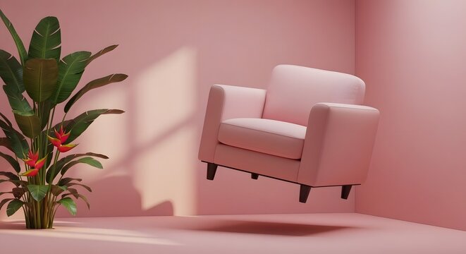Levitating armchair gracefully suspended in a pastel pink room. The armchair is upholstered in a soft, textured fabric and features rounded edges. The room's walls are a muted rose