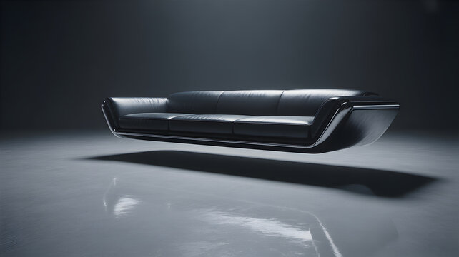 Futuristic black leather sofa levitating in dark studio with dramatic lighting