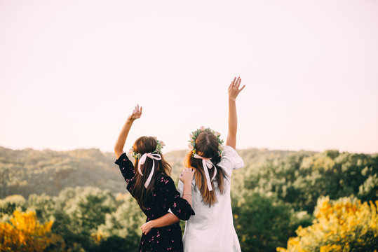 Happy cheerful lesbian brides hugging on their wedding day. Female gay couple surrounded with flowers. Homosexuality, same-sex marriage and love concept.
