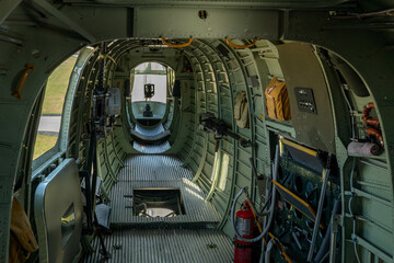 interior aft of B-24 bomber as it climbs away from an airport with view of the runway out of the windows and gun turret