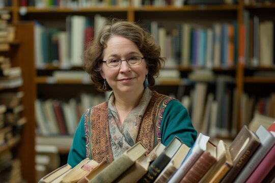 Cheerful female librarian in glasses poses with a warm smile in a library setting
