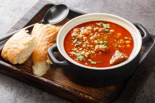 Traditional soup Chorba Frik made from lamb, Freekeh and vegetables close-up in a plate on the table. Horizontal