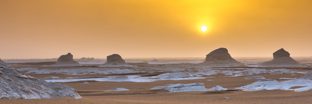 White Desert at Farafra in the Sahara of Egypt. Web banner in panoramic view.