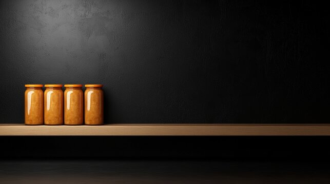 Three glass jars with orange lids sit on a wooden shelf against a black wall.