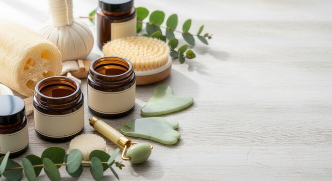 A collection of spa and self-care items including a loofah herbal compress glass jars a brush jade tools and eucalyptus on a light wooden surface