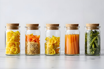 Minimalist kitchen design featuring five glass jars with various pasta shapes