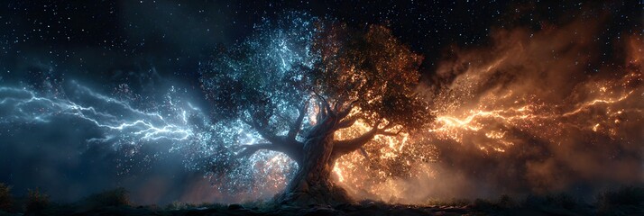 Cosmic tree of life divided by elemental forces of blue light and fiery orange energy