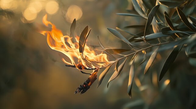 Symbolic Olive Branch Burning in Warm Glowing Flames