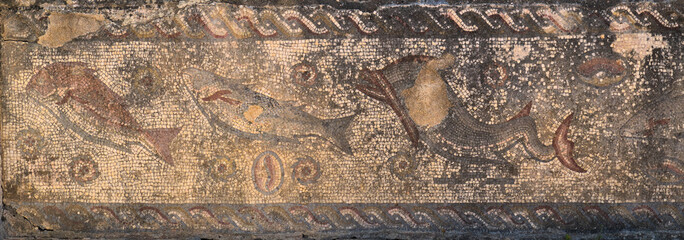Antique Roman mosaic with sea life motifs located at the archaeological site of Milreu, in Estoi, Algarve, Portugal