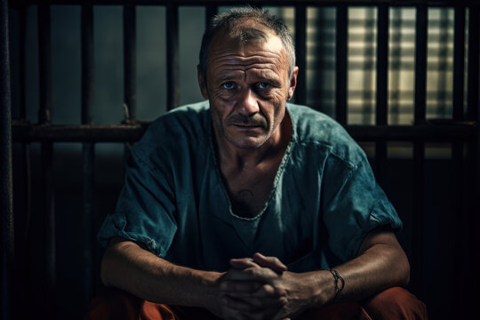 Portrait of Incarcerated Man Behind Prison Bars in Moody Lighting