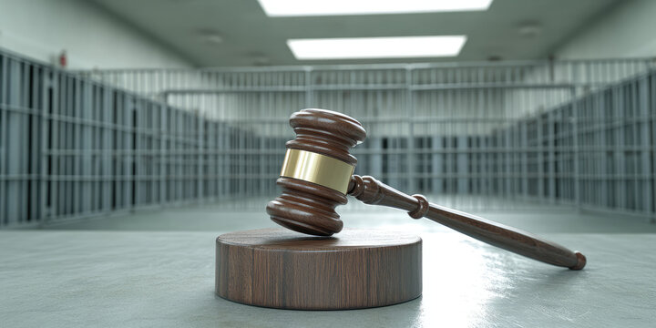 This image illustrates the verdict from the prosecution leading to a life sentence. A gavel strikes a round block while a prison cell looms in the background, embodying justice, judgment, punishment,