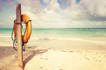 life belt, life saver hung on wooden pole on beach, foreground focused.
