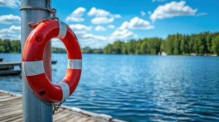 A red and white ring buoy hanging on a metal pole by a dock, with a lake in the background.