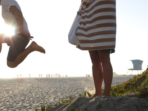 Man jumps off dune into sun as woman watches