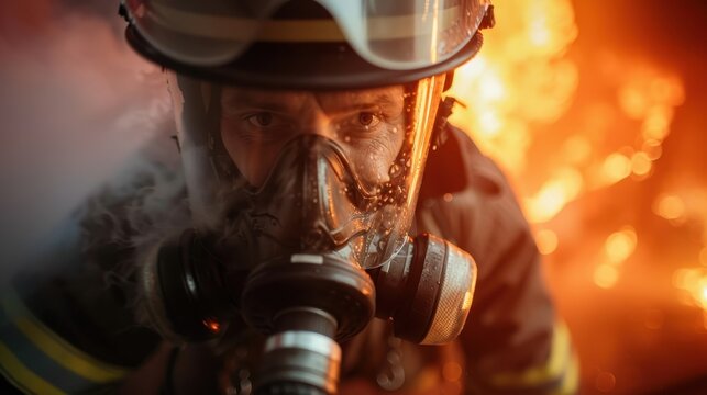 A firefighter wearing protective gear and a gas mask is seen amidst a blazing fire, highlighting the intense environment and the protective measures taken to ensure safety while fighting fires.