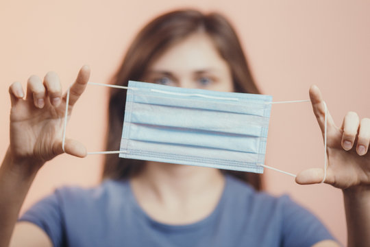Portrait of young woman showing opened medical flu mask covering face on colored studio background, quarantine measures and life saving concept