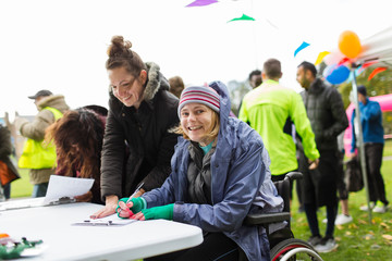 Portrait smiling woman in wheelchair checking in for charity race in park
