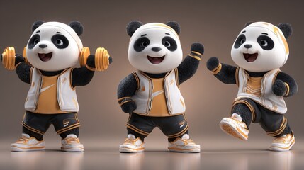 Three cheerful cartoon pandas in sportswear one lifting weights others posing dynamically