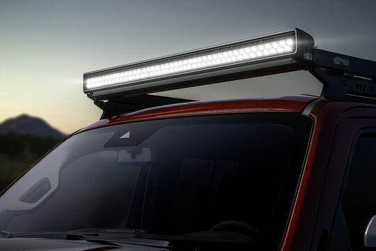Powerful led light bar illuminating the roof rack of a 4x4 vehicle at dusk