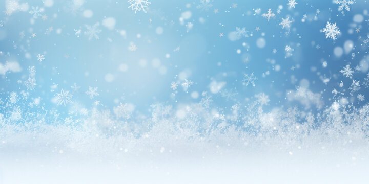Winter snow background with snowdrifts, with beautiful light and snow flakes on the blue sky, beautiful bokeh circles, banner format, copy space