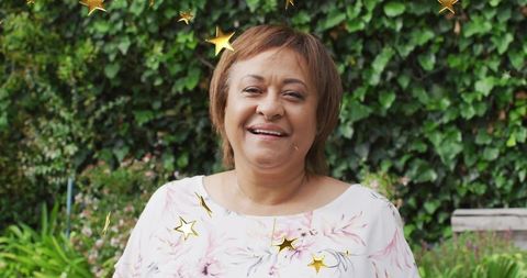 Smiling mature woman wearing floral blouse standing in garden with floating gold stars