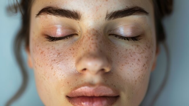 Natural beauty of a freckled woman close-up with light brown hair against a soft white background highlighting her unique features and fresh complexion