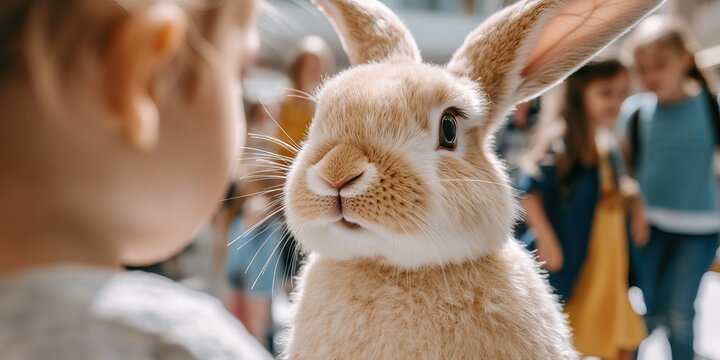 Light Brown Rabbit with Blurred Children in Background