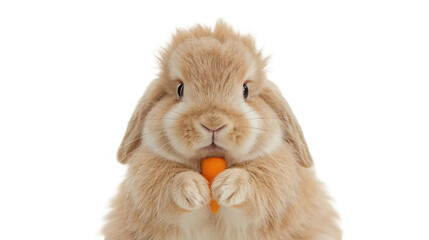 Cute light brown rabbit holding and eating a small orange carrot on white background, closeup portrait