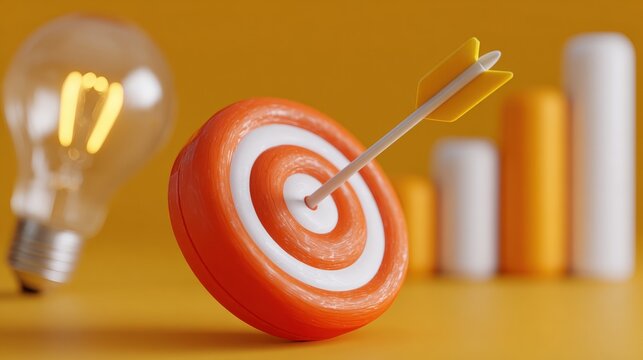 A dart hits the bullseye of a target against a backdrop of a light bulb and bar graph, symbolizing success and innovation.