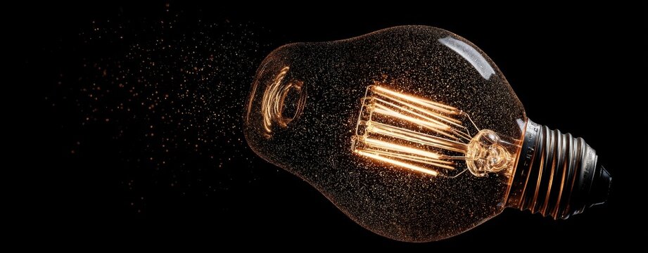 Light bulb floating out of a gift box with a black ribbon and bow on a black background, innovative and sleek
