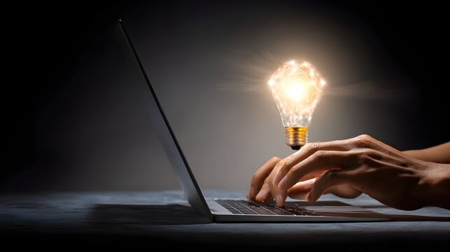 Hands typing on laptop with vibrant glowing lightbulb hovering