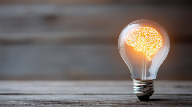 Creative concept of brain shaped filament glowing inside clear light bulb on wood