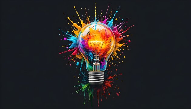 A vibrant explosion of color erupts from a black light bulb, showering a sleek black background with swirling paint and dynamic splashes, igniting a spark of creativity and innovation. Think