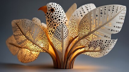 A light grey fabric-covered smart speaker sits on a white surface against a vibrant, multicolored backdrop.  A subtle light ring encircles its base
