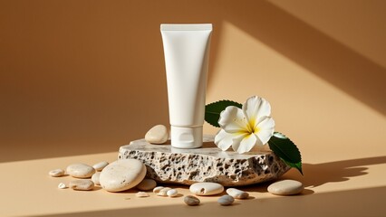 white tube cream placed top round stone base base light colored stone speckled texture next base single white flower yellow center green leaves background beige color shadow cast right side also few