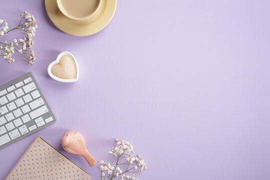 Flat lay, top view cute office table desk. Feminine workspace with keyboard, coffee cup, notebook, heart shaped candle, bird, flowers on pastel purple background.