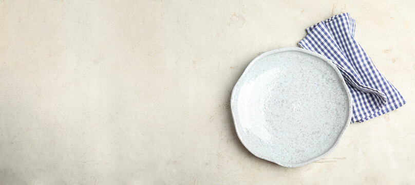 Kitchen towel on empty wooden table. Napkin close up top view mock up for design. Kitchen rustic background.