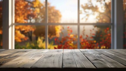 Empty table top and blurred autumn trees and colorful leaf background for display or montage your products