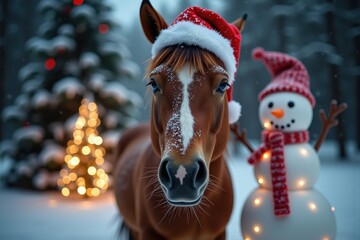 Two horses nuzzling in winter, snow background