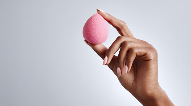 Hand showcasing light pink nail polish while holding a pink makeup sponge delicately between fingers against a soft light grey background, emphasizing elegance and beauty in makeup application