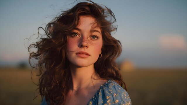 Portrait of a young woman with curly brown hair and freckles, wearing a blue floral dress, bathed in warm golden-hour light. Concept Golden-hour Portrait, Freckled Beauty, Curly Brown Hair