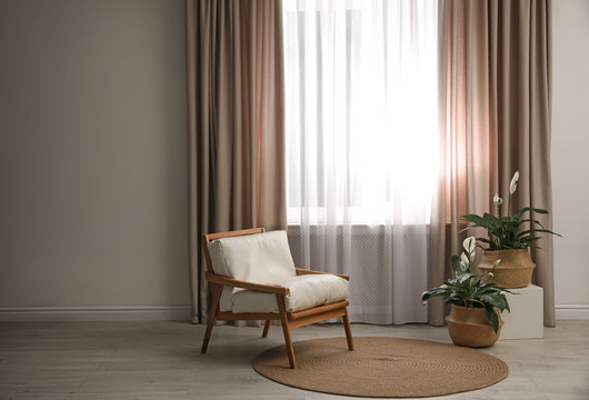 Sunlit modern bedroom with sheer curtains and cozy chairs