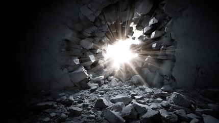 A crumbling mental wall breaking into fragments, with rays of light shining through the cracks, symbolizing breaking old beliefs and letting in new insight