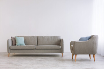 Cabinet or gray living room at home and minimalism in scandinavian design