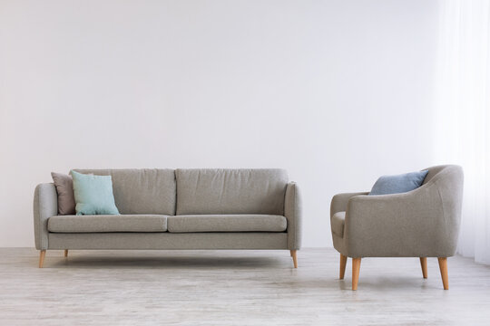 Two plain white throw pillows resting on a light gray couch in a living room setting.  Soft, simple decor