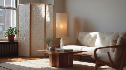 Modern living room with a beige sofa and a wooden coffee table in the center. the sofa is upholstered in a light beige fabric and has a curved backrest and armrests.