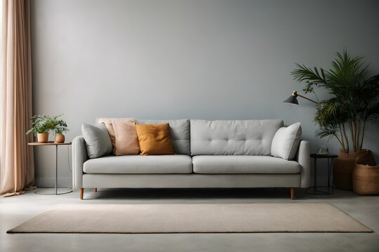 Bright light grey couch near color solid wall. Generative AI.