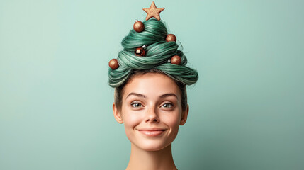Dreamlike portrait of smiling adult woman with curly hair and glowing feather light wisps