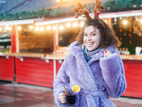 curly haired woman in trendy violet coat drinks mulled wine outdoors, festive background