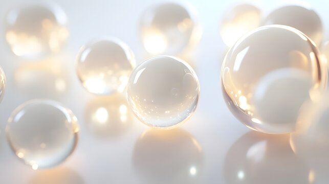Glowing Light Orbs: Bright, glowing orbs of light floating in mid-air, casting soft reflections on a white background.